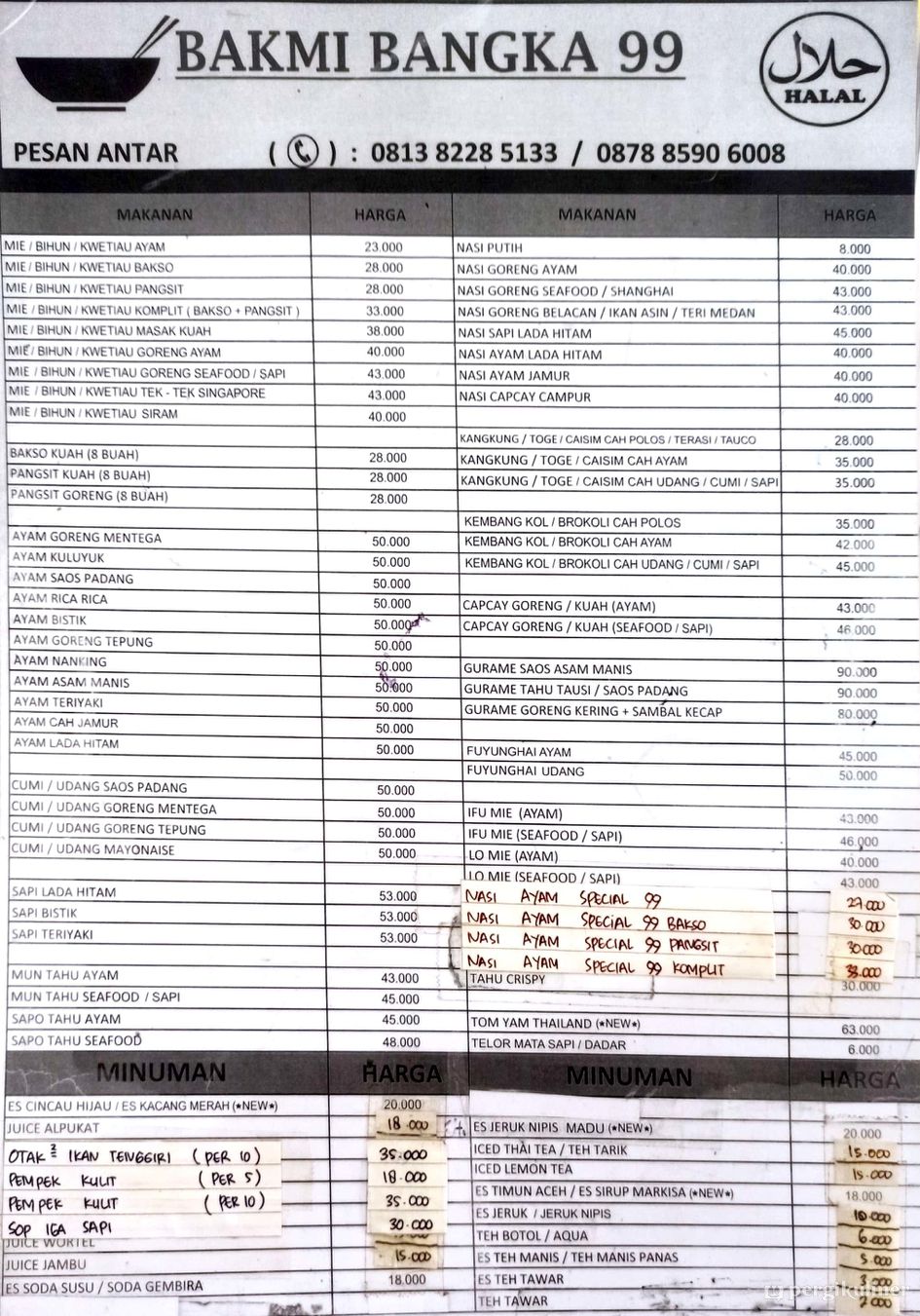 Berlokasi di Jakarta, Bakmi Bangka 99 menyajikan mi kenyal dengan kecap asin racikan bumbu spesial, dan taburan ayam yang superempuk. Warung bakmi ini selalu ramai dikunjungi di saat jam-jam makan siang dan pada hari libur.